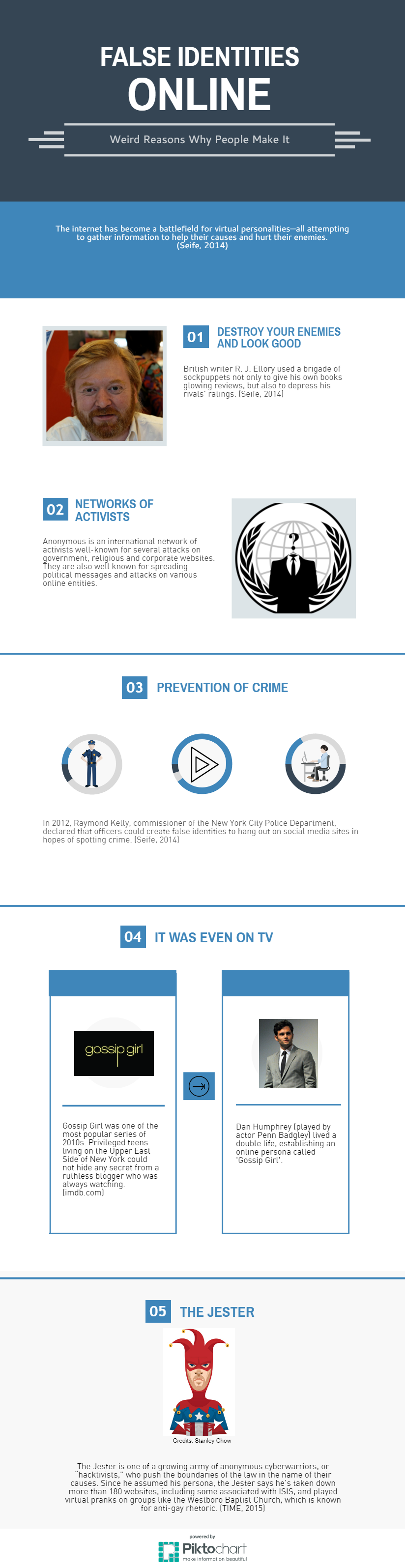 Building up on the point made earlier, creating sockpuppets online became easier than ever and this led to the birth of false identities on the internet (Seife, 2014). The justification is described in the following infographic and supported by a few examples.
