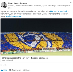 Furthermore, the organiser shared the article on his LinkedIn account and it got 21 likes.