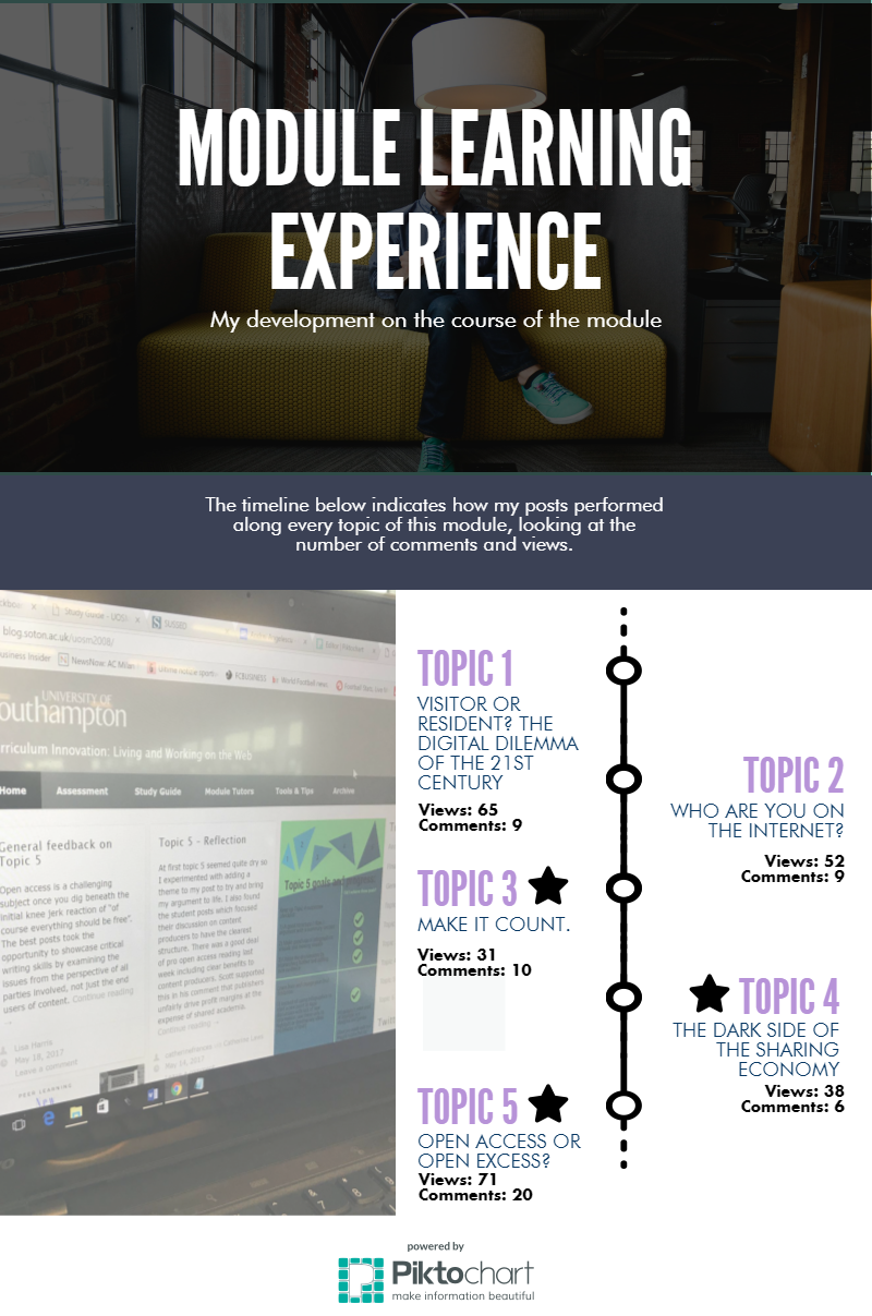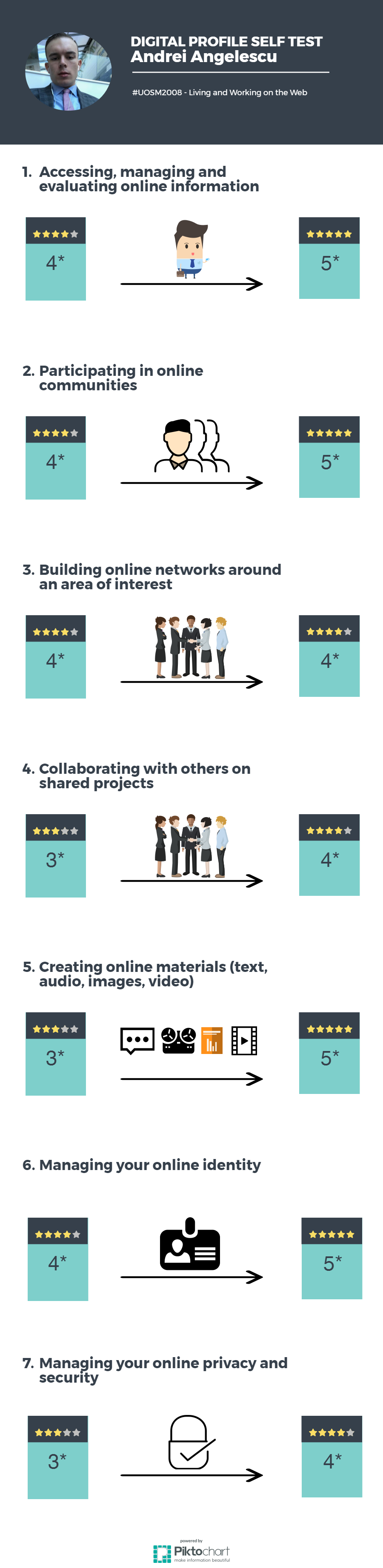 I believe that the quality of the post was improved a lot by making appropriate use of infographics. If at the beginning of the module, I was unsure about how to design an effective infographic, now I consider myself very comfortable with creating these. This, along with my ability of creating videos and other types of illustrations, made me award myself 5* in the content creation section, where I consider that I recorded the most significant progress.