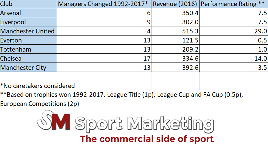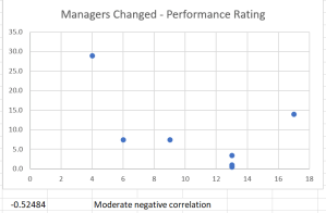 I did the same thing for performance, awarding a score to each club based on the main honours of the clubs. 2 points were awarded for European competitions won, 1 point for each Premier League title and 0.5 for League Cup or FA Cup. The results are the same: negative correlation showing that the less managers a club had, the more successful it was.
